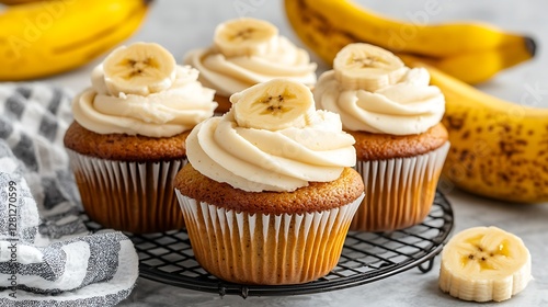Banana cupcakes with frosting sit on rack, bananas blurred background, dessert, food blog