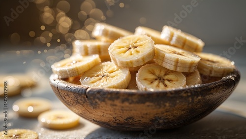 wooden, slice, banana, bowl, fruit, wooden bowl, healthy, food, fresh, diet, nourishment, sweet, vegetarian, vegan, delicious, tropical, macro, closeup, still life, bokeh, natural light, ripe, yellow