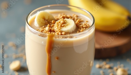Banana smoothie topped with crushed peanuts and cereal sits in a glass, with a whole banana in the background, creating a nutritious and delicious visual