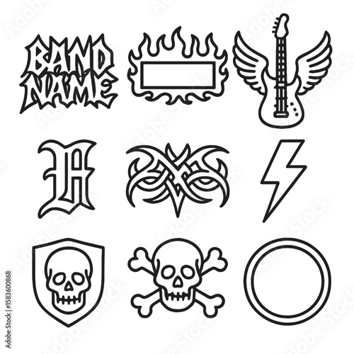 Band Logo Icons. Line style icons of Band Logo Elements: stylized band name, flame border, winged guitar, gothic font, tribal