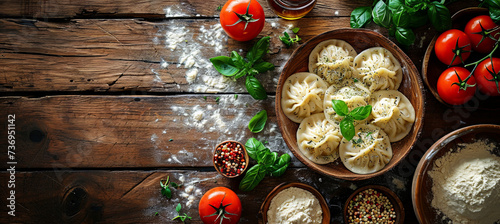 banner of Manti on the wooden background. Concept of Turkish and Central Asian cuisine