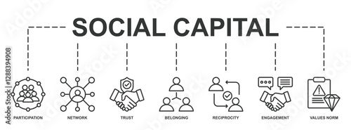 Banner of Social Capital web vector illustration with icons of participation, network, trust, belonging, reciprocity, engagement, and values norm.