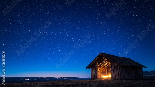 Banner showing the birth of Jesus Christ in a rustic wooden stable, warm golden light emanating from the manger, set against a deep blue night sky