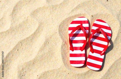 Banner. Top view of red beach shoes on sand background with space for inscription.