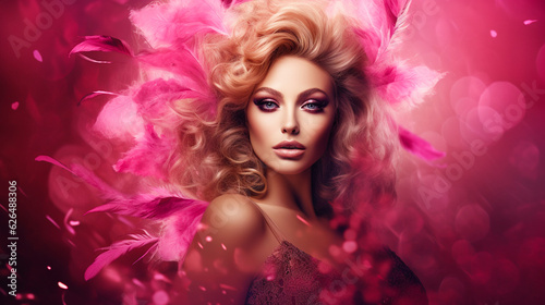 beauty, banner, space, girl, make up, woman, fashion, model, face, hair, eye, make-up, make-up, lip, closeup, closeup, people, person, cosmetic, skin, glamour, elegance, care, background, wallpaper, screensaver, decoration, art, card, frame, illustration, flower, design, feather, lady, party, 1, feather, pink, dress