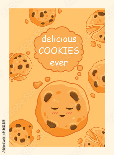 Banner with cookie. Cafe or restaurant menu, promotional graphic element for website. Flour products, bakery. Template, layout and mock up. Dessert and sweet. Cartoon flat vector illustration