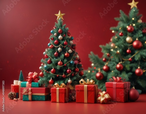 christmas, tree, gift, holiday, decoration, box, christmas, present, celebration, year, ribbon, christmas tree, winter, ornament, new, present, ball, fir, gift, bow, pine, season, green, red, star, illustration, new year, december, design, vector, snow, isolated