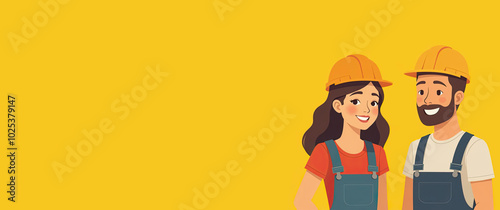 Banner with two Happy Builders in helmets, yellow background. Young Man and Woman Construction workers. Empty copy space for your text. Creative idea for design