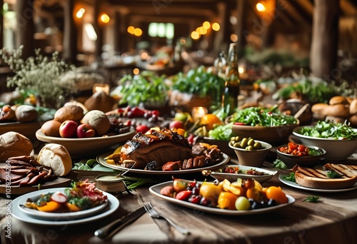 banquet, table, formal, event, linen, tablecloth, plate, silverware, wine, goggles, candle, curtain, dish, roasted, meat, fruit, bread, salad, rustic, wooden, beam, lighting, floral, napkin, glassware, stage, cake, instrument, string, light, epicure, cheese, charcuterie, garden, lantern, buffet, serving, station, marble