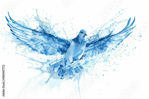 Baptism, the Holy Spirit. Dove with open wings and splashes of water on white background.