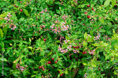 Barbados cherry a.k.a. wild crapemyrtle a.k.a. acerola (Malpighia glabra) with pink flowers and red berries - Davie, Florida, USA