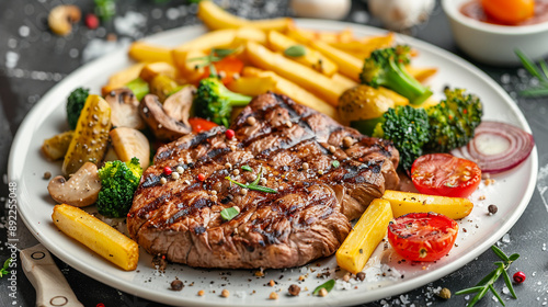 Barbecue antricote steak with vegetables and mushrooms on a plate stands on the table.