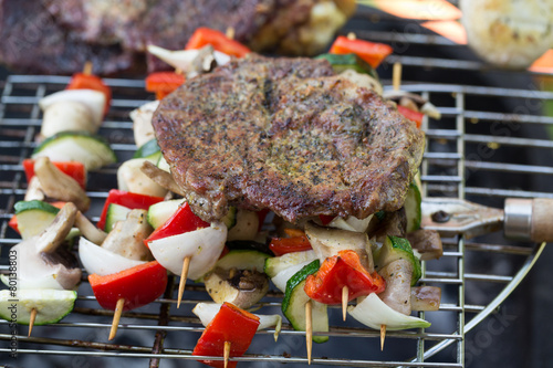 grill, grilled, grilling, roast, beef, dinner, food, champignon, closeup, cholesterol, sausage, bar-b-q, lamb, picnic, mushroom, pork meat, onion, flames, porky, steak, fire, cookery, appetising, calorie, sizzle, heat, broil, charcoal, meat, pepper, paprika, delicious, shish, courgette, red, snack, shashlik, vegetable, spice, stick, courgette, colourful, sliced, marinated, portion