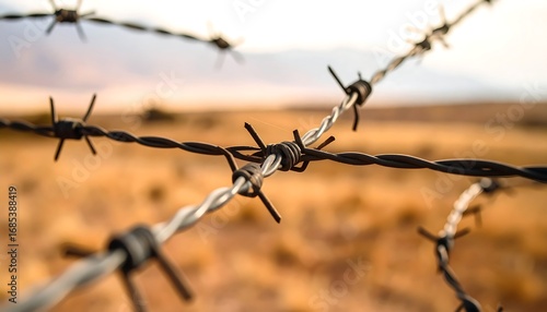 Barbed wire fence stretches across a dry, golden landscape. Close-up view