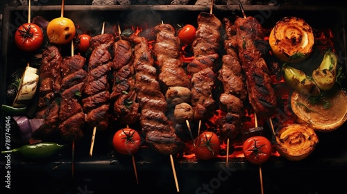 Barbeque food party grilling meat with various vegetable. Top view image.