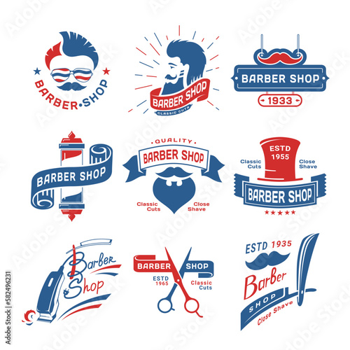 barbershop, barbershop, barber, vintage, label, vector, illustration, isolated, on white, flat, set, bundle, collection, minimalist, logotype, logotype, company, identity, marketing, brand, emblem, art, pictogram, business, design, advertising, advertisement, advertisement, icon, retro, old-fashioned, hipster, male, man, grooming, beauty, salon, gentleman, haircut, hair, care, beard, moustache, shave, trim, scissors, red, blue, tags