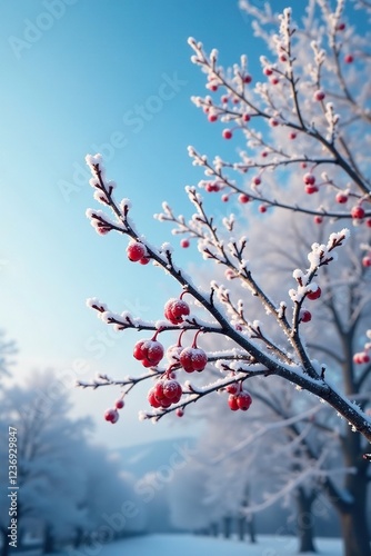 Bare Aronia branches with hoarfrost and blue sky, branch, bare branch, tree