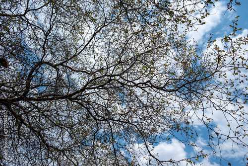 Bare tree branches, blue cloudy sky background, deciduous plants in winter