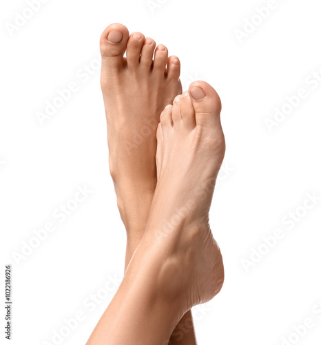 Barefoot woman on white background, closeup view