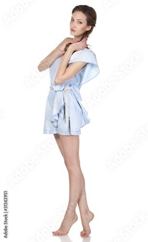 woman, female, dress, summer, posing, beauty, beautiful, portrait, fashion, standing, barefooted, adult, 1, single, person, people, vertical, studio, isolated, jean, casual attire, caucasian, young, looking, serene, calm, calmness, long, hair, brunette, attractive, pretty, style, model