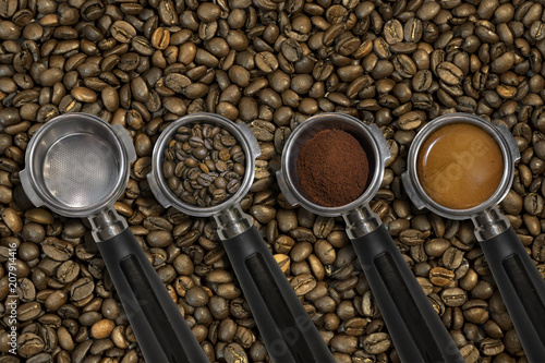 Barista spoon or scoop crossing from empty to a filed spoon with espresso and coffee beans background