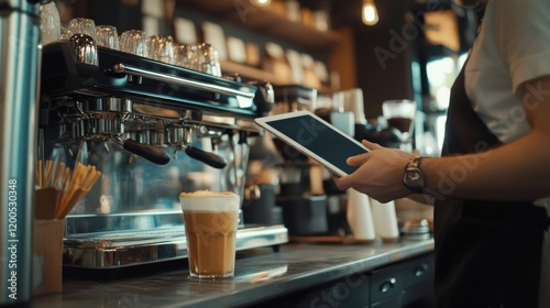 barista, hot drink, shop, cafes, tablet, digital, technology, espresso, machine, latte, cappuccino, drink, beverage, eatery, business, client, service, order, menu, food, hand, device, screen, modern, interior, counter, work, job, employee, professional, preparation, equipment, kitchen, commerce, retail, industry, occupation, lifestyle