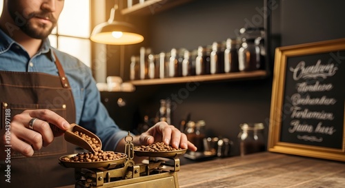 Barista weighing coffee beans on a vintage scale in a cozy cafe with warm lighting and shelves of coffee supplies