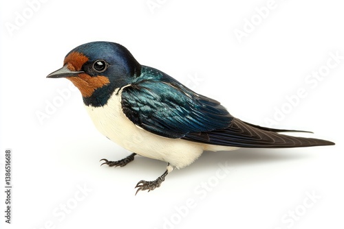 Barn Swallow Standing Isolated on White Background with Detailed Plumage