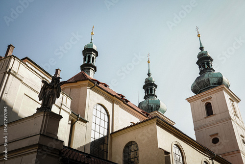 prague, czech republic, church, baroque, architecture, tower, dome, religious, sculpture, statue, europa, city landscape, historic, catholic, skyline, no people, blue skies, travel, tour tourism