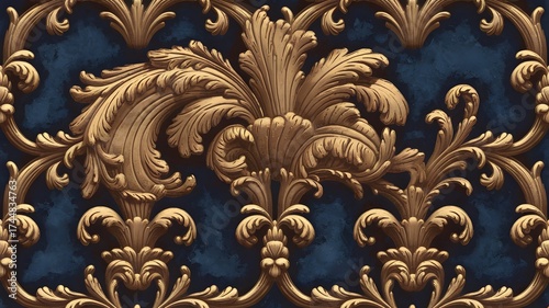 Baroque Floral Swirl Seamless Pattern with Gold Edges on Deep Blue