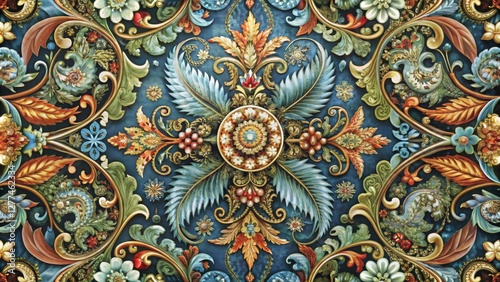 Baroque Rococo Floral Ornament Digital Art, Teal Background, Symmetrical Composition, Ornate Design Baroque, Rococo