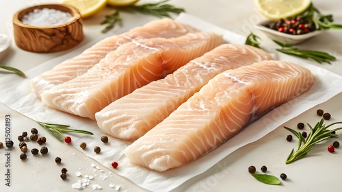 Barramundi fillets glisten with freshness, showcasing their delicate pink hue. Accompanied by spices and herbs, they promise a delicious culinary experience.