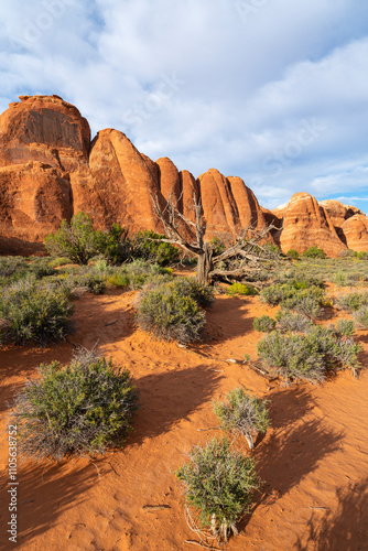 Barren tree and rock formations near Skyline Arch, Arches National Park, Moab, Utah, United States of America, North America