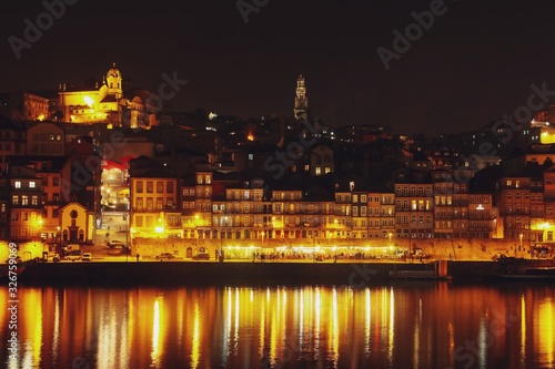 Barrio de la Ribeira de Oporto iluminado en la noche y su reflejo en el río Duero. Fotografía desde Vila Nova de Gaia (Portugal).