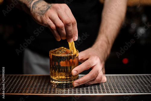 Bartender adding to a cocktail in the glass a lemon zest as a decor
