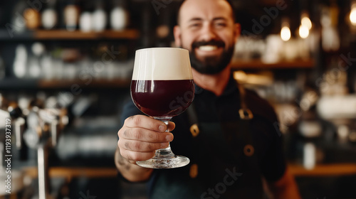 bartender offering a beer in a smiling glass