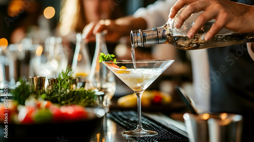 Bartender pouring a classic martini, vibrant garnishes prepared on the counter, guests enjoying conversations