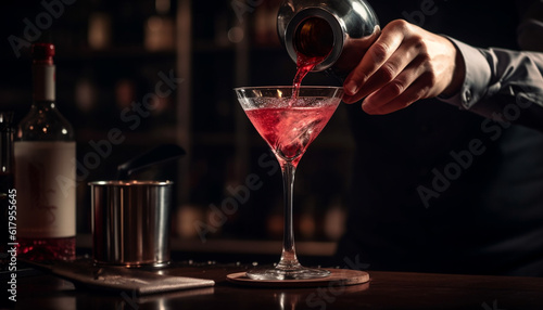 Bartender pouring cocktail into martini glass at elegant bar counter generated by AI