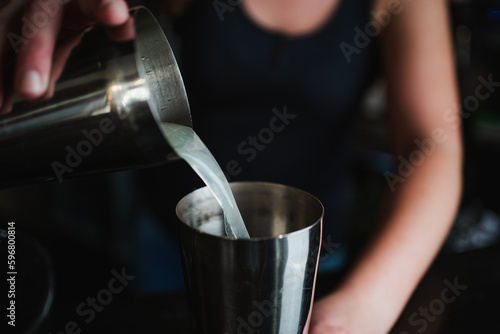 Bartender pouring lemon juice into a cocktail shaker to prepare a pisco sour