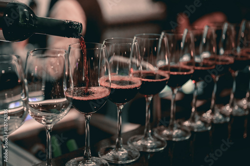Bartender pouring red wine into a wine glass..Restaurant, beverage, alcoholic beverage concept.