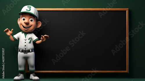 Baseball coach character with blackboard, chalkboard isolated background with copy space, 3D rendering