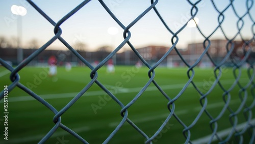 baseball field urban. A blurred view of a sports field through a chain-link fence, suggesting an active game or practice session.