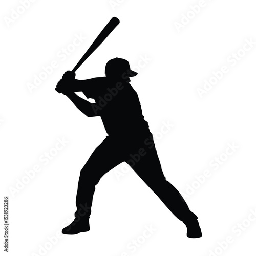 baseball, player, silhouette, batting, swinging, action, pose, sport, game, athlete, black, white, graphic, vector, illustration, design, isolated, background, uniform, cap, hitter, bat, active, dynamic, powerful, competition, energy, strength, sporting, event