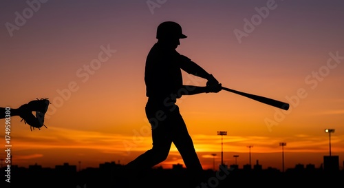 baseball, player, swing, bat, silhouette, sunset, sport, evening, orange, purple, sky, twilight, dark, action, photo, sportsman, sport, athletic, professional, amateur, game, batting, sporting, athletic, exercise, activity, team, leisure, entertainment, copy space, horizontal, photo, image, visual, golden hour