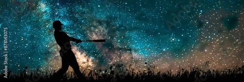 Baseball Player Under the Milky Way - A silhouette of a baseball player holding a bat, standing in a field of grass under the Milky Way, with thousands of stars visible in the night sky. - A silhouett