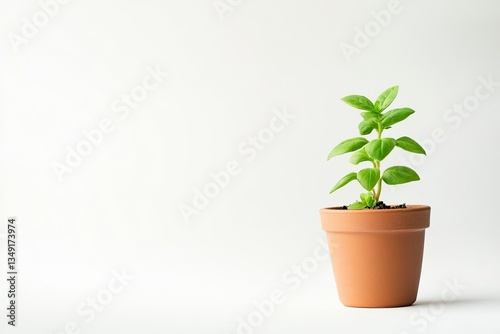 Basil Plant Growing in Small Terracotta Pot Against Clean White Background