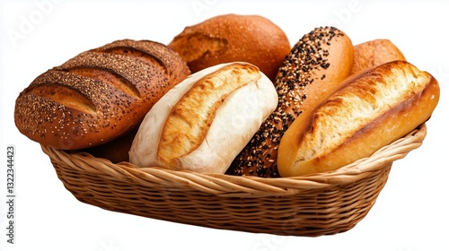 Basket of Artisan Breads: A rustic basket overflows with a tempting assortment of freshly baked artisan breads, capturing the essence of a cozy bakery or home kitchen.
