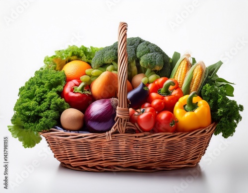 basket of fresh colorful vegetables and fruits in three variations isolated on white background