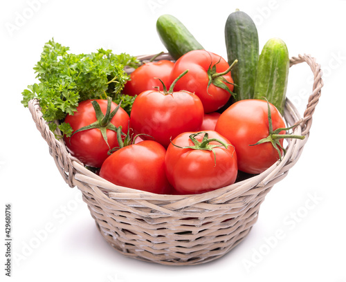 Basket with vegetables. Tomatoes, cucumbers and parsley in a basket. Isolate on white background