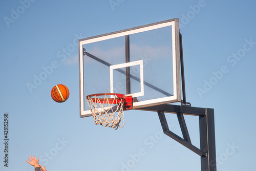 basketball, hoop, basket, sport, net, sky, ball, game, backboard, blue, competition, play, court, sport, goal, score, white, team, equipment, board, ring, orange, recreation, high